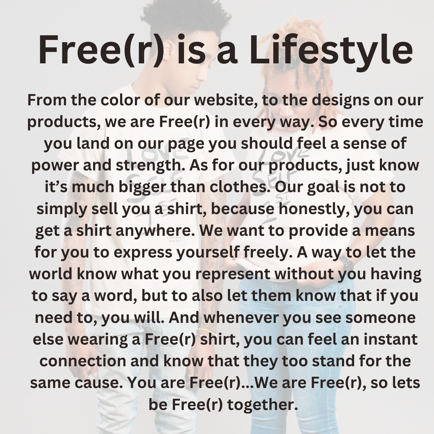 Where you can be your authentic self. Where you are no longer under the control or power of another. Where you are free to live life on your own terms because being you is a whole vibe. When you are Free(r) you have learned to love yourself first. Most importantly you will not be confined... You are Free(r).